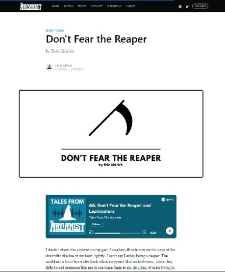 My flash fiction piece, “Don’t Fear the Reaper,” is featured on The Arcanist. It’s also on Tales from The Arcanist, the corresponding podcast available right on the page with the story or via Spotify.