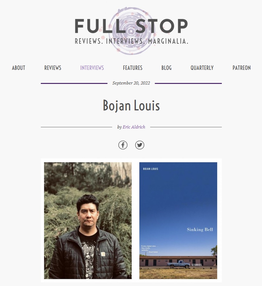 Tomorrow, September 27, 2022, is the release date of Bojan Louis’s new short fiction collection, Sinking Bell (Gray Wolf Press). Sinking Bell is Bojan’s latest book since his 2017 American Book Award-winning poetry collection, Currents (BkMk). I asked Bojan some questions about Sinking Bell for Full Stop and you can read our discussion here.